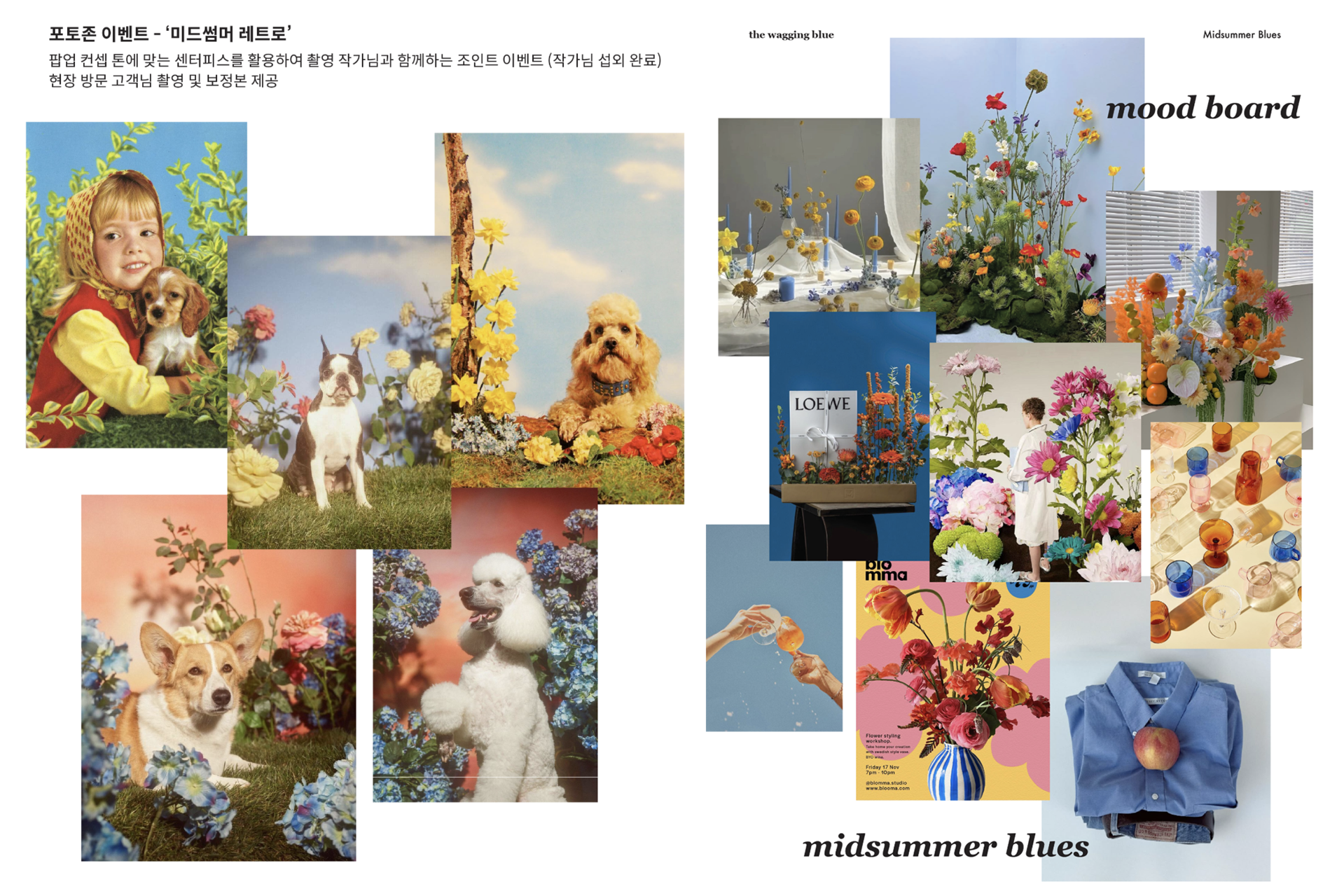 당시 무드보드로 이미지들을 모아보았는데 색감이 강한 꽃이 가득한, 즐겁고 편안한 무드가 떠올랐어요. “블루즈”는 더웨깅블루가 주최해서 진행하는 행사이기도 하고, 너무 더워서 슬프지만 함께 이겨내는 - 우울할 수 있지만 그 속의 아름다움을 전달하고픈 마음에서 잘 어울리는 서브 단어라 완벽했죠.